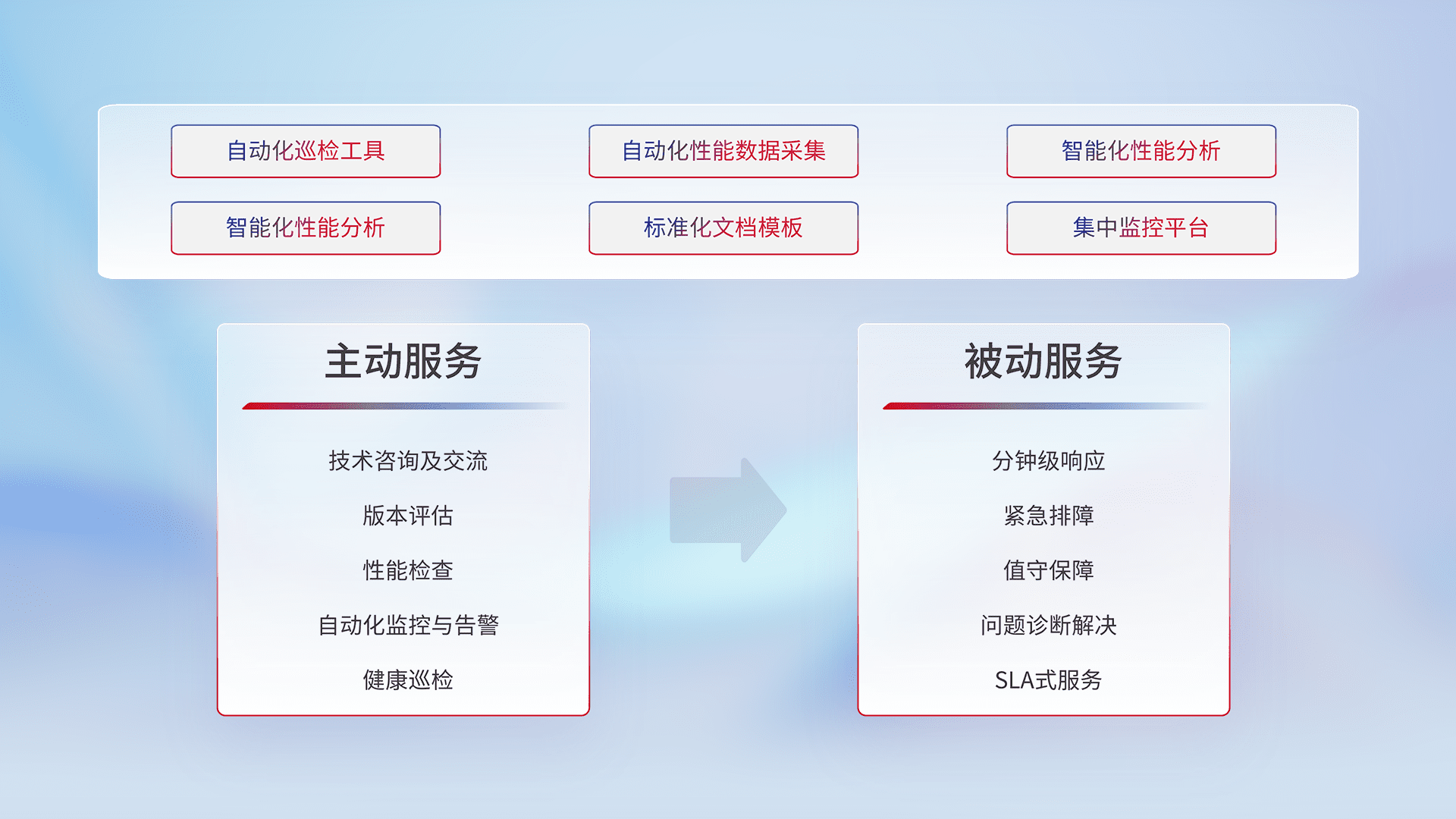 智能化工具和标准化文档,,,保障服务质量,,,,提供主动服务(包含技术咨询、、版本评估、、、、性能检查、、、自动化监控与告警、、、、健康巡检)和被动服务包含(分钟级响应、、、、紧急排障、、、值守保障、、问题诊断解决、、、SLA服务)。。